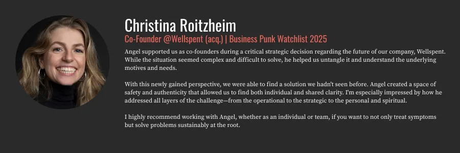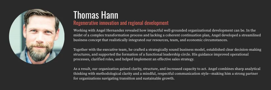 I work at the intersection of inner capacity and structural design. As a Conscious Organisation Architect, I partner with founders and leadership teams to evolve governance, culture, operating model, and team dynamics as one coherent system.